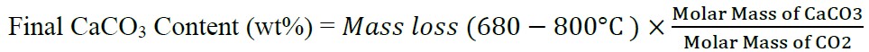 CaCO3 content was used to calculate the amount of LF that was consumed in the chemical reaction. The initial CaCO3 content (prior to mixing), expressed in percentage by weight (wt%), was calculated according to Equation 3. The final CaCO3 content was calculated using TG/DTA mass loss at approximately 680 to 800°C as presented in Equation 4 (Maria 2011). The amount of reacted LF was calculated using Equation 5.