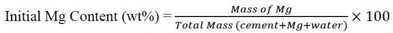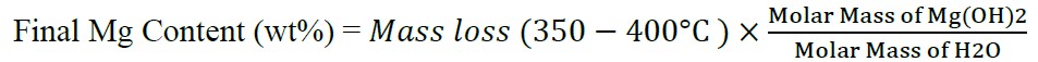 Similarly, the initial content of Mg was calculated using Equations 6. Mass loss corresponding to the decomposition of Mg between 350 and 400°C was used to calculate the final Mg content as presented in Equation 7. Ca(OH)2 content was measured using TG/DTA mass loss between 450 to 500°C as presented in Equation 8 (Maria 2011).