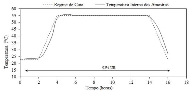 As amostras de pasta e argamassa foram curadas a vapor a 55°C e 95% de umidade relativa (UR) por 16 horas, conforme apresentado na Figura 2. Foi utilizada uma câmara ambiental de Cincinnati Sub-Zero de 0,45 m3. Uma temperatura máxima de cura de 55°C foi usada para evitar qualquer formação de etringita tardia (Brunetaud et al. 2006). Após a cura a vapor, as amostras foram colocadas em água saturada de cal a 23 ° C até serem ensaiadas.