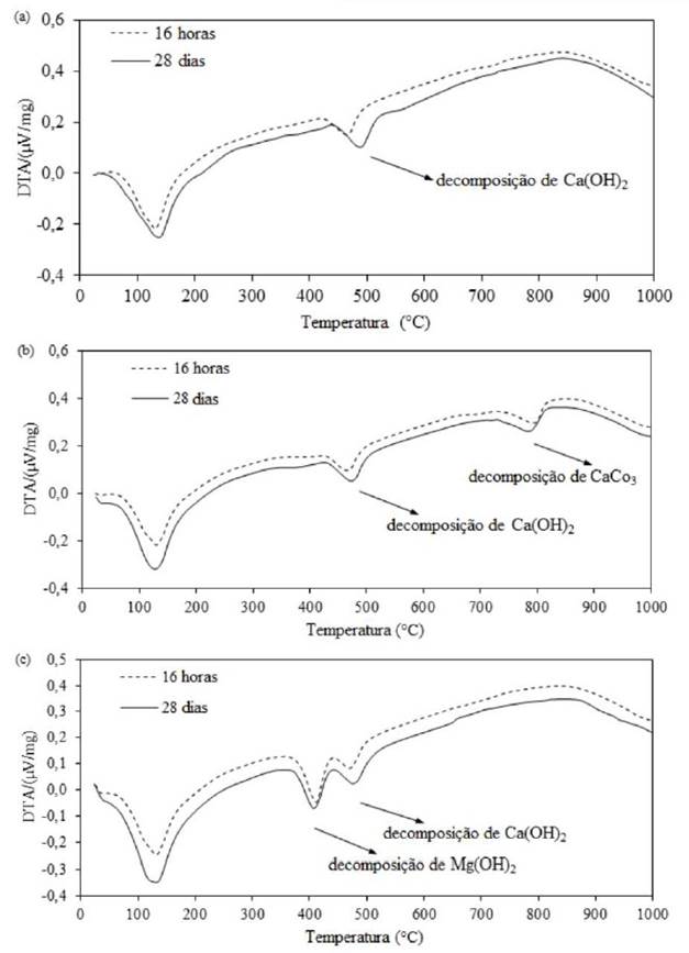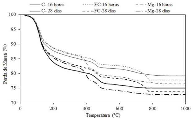 A análise térmica foi usada para medir a quantidade de FC reagido e para confirmar que o Mg é material quimicamente inerte. Além disso, uma avaliação relativa dos produtos de hidratação foi realizada usando o teor de Ca(OH)2. A perda de massa da análise de TG e os resultados do DTA são apresentados nas Figuras 4 e 5, respectivamente. A Figura 4 apresenta a perda de massa com a temperatura. A Figura 5(a) apresenta os resultados de DTA para o traço de controle feito com 100% de cimento, enquanto as Figuras 5(b) e (c) apresentam os resultados de DTA para as traços feitos com FC e Mg, respectivamente. Com base nos dados medidos, o conteúdo de Ca(OH)2, CaCO3 e Mg foi calculado usando as Equações 3 a 8. Os resultados nas Figuras 4 e 5(b) mostraram que a adição de FC aumentou o teor de Ca(OH)2 em 16 horas em comparação com o traço de controle feito com 100% de cimento. O conteúdo de Ca(OH)2 aumentou de 7,4% em peso no traço de controle feito com 100% de cimento para 8,6% em peso no traço com FC. Isso é esperado, pois a área de superfície adicional fornecida pelo FC atua como locais de nucleação para a precipitação dos produtos de hidratação. Isso acelera o processo de hidratação, resultando em um maior teor de Ca(OH)2 no traço com FC em comparação com o traço de controle feito com 100% de cimento. Aos 28 dias, o teor de Ca(OH)2 no traço com FC e o traço de controle feito com 100% de cimento eram aproximadamente semelhantes (11,9% em peso no traço de controle feita com 100% de cimento e 12,2% em peso no traço com FC).