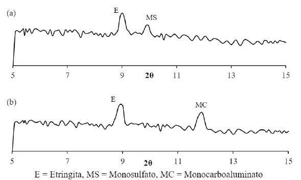 A difração de raios-X foi usada para confirmar a presença de monocarboaluminato de cálcio na pasta de cimento hidratado no traço com FC. A Figura 6 apresenta os resultados da difração de raios-X para o traço de controle (Figura 6.a) e o traço com FC (Figura 6.b). Os resultados mostraram que um pico a aproximadamente 12° 2θ representando mono-carboaluminato de cálcio foi observado no traço com FC enquanto o pico de monossulfato foi observado nos resultados de difração de raios-x do traço de controle.