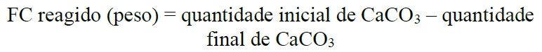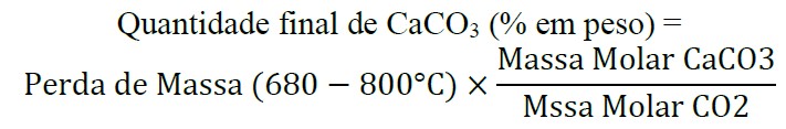 O teor de CaCO3 foi utilizado para calcular a quantidade de FC consumido na reação química. O conteúdo inicial de CaCO3 (antes da mistura), expresso em porcentagem em peso (% em peso), foi calculado de acordo com a Equação 3. O conteúdo final de CaCO3 foi calculado usando a perda de massa TG/DTA a aproximadamente 680 a 800 ° C, conforme apresentado na Equação 4 (Maria 2011). A quantidade de FC reagido foi calculada usando a Equação 5.