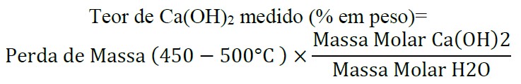 Da mesma forma, a quantidade inicial de Mg foi calculada usando as Equações 6. A perda de massa correspondente à decomposição de Mg entre 350 e 400 °C foi usada para calcular o teor final de Mg, conforme apresentado na Equação 7. A quantidade de Ca(OH)2 foi medida usando a perda de massa TG/DTA entre 450 e 500 °C, conforme apresentado na Equação 8 (Maria 2011).
