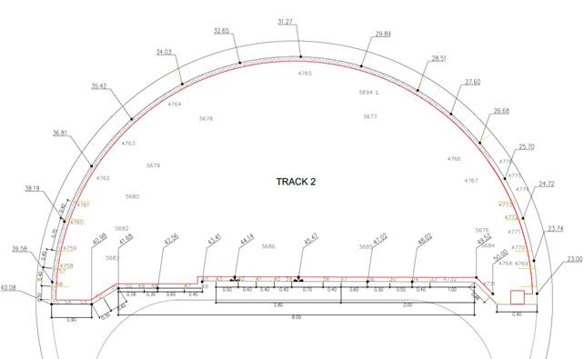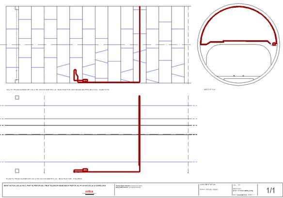 O túnel instrumentado L9 é uma seção típica com faixas sobrepostas e laje intermediária. A fibra óptica foi colocada no perímetro da seção transversal, sempre de acordo com a Propriedade. A Figura 3 mostra seu posicionamento. A colocação das fibras foi realizada seguindo o perímetro de uma seção transversal na posição indicada no plano.