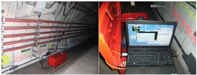 O comprimento real de monitoramento do túnel é ajustado ao comprimento real de uma seção transversal e de uma seção longitudinal, sendo esta uma distância de 50,00m de comprimento. Ou seja, a fibra óptica FOD1 (Fibra Ótica Distribuída) é fixada 40m e os últimos 10m foram mantidos na bobina contendo a fibra óptica (não fixada), que foi fixada na estrutura com fita adesiva. Este detalhe pode ser visto na Figura 8, Figura 9 e Figura 10, juntamente com o sistema instalado dentro da seção transversal do túnel.