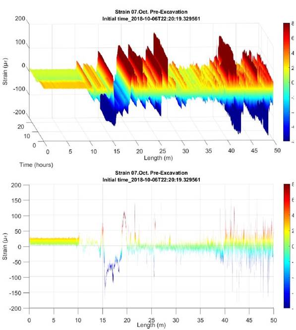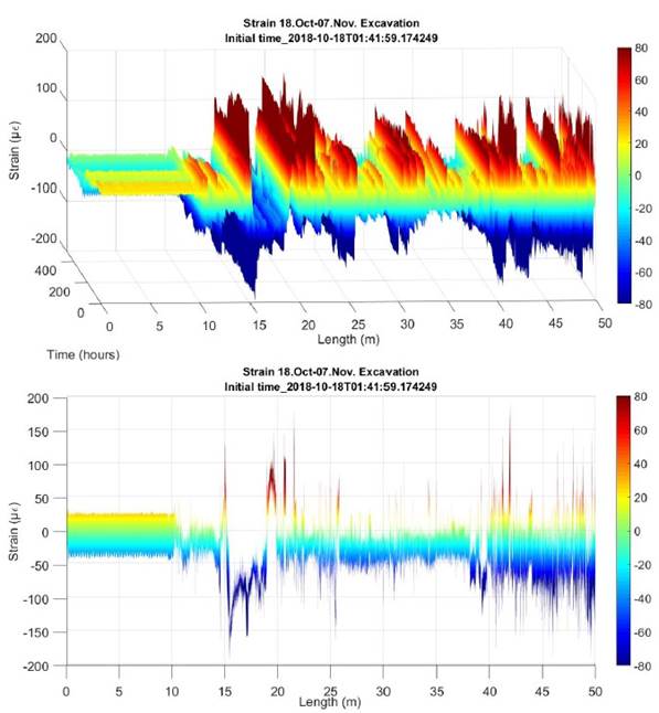 É discutido o exemplo de um caso real em que, em um túnel existente, um edifício é construído com instrumentação de fibra ótica que permite monitorar o histórico de carregamento de uma estrutura desde sua instalação. Para verificar se o túnel não é estruturalmente afetado durante o período de construção, trechos do túnel são instrumentados e as microdeformações ocorridas são medidas, as quais são comparadas com as do modelo. Foi possível apreciar as ovalizações e tensões na abóbada durante as diferentes fases do processo de construção, estando todas abaixo dos valores limites estabelecidos no plano de contingência. Esta técnica permitiu validar os trabalhos realizados ao longo do processo.