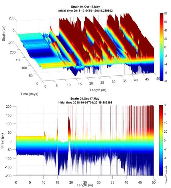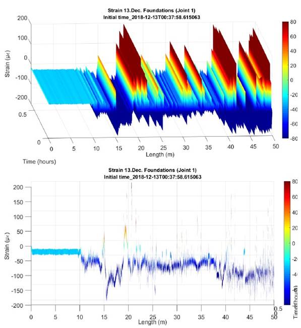 Da mesma forma, podem ser observados picos e/ou descontinuidades obtidos com o monitoramento, que correspondem às áreas de ligação entre trechos dos segmentos onde a fibra ótica sofre uma desaderência com o concreto, já desde sua implantação na origem. Esses picos permanecem estáveis no que diz respeito à sua localização.
