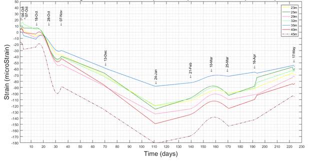 Em cada leitura posterior colocadas nas diferentes fases da obra (antes do início, esvaziamento, acabamento da fundação, estrutura e final da obra), são medidas as microdeformações nos perímetros das seções transversais, comparadas com o modelo executado e emitido relatórios. Quando os critérios de ovalização prescritos nos regulamentos forem ultrapassados ou forem detectados defeitos, as ações serão tomadas de acordo com o protocolo do plano de contingência estabelecido.