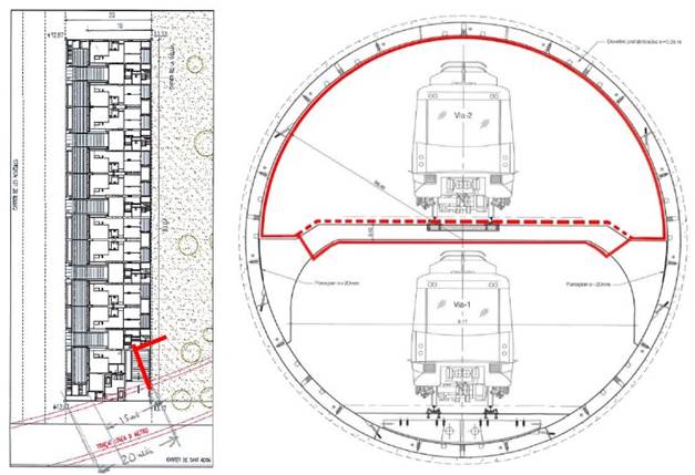 | Figura 3. Planta de detalle del edificio con relación al túnel del metro y sección del trazado de la fibra óptica. | ||||