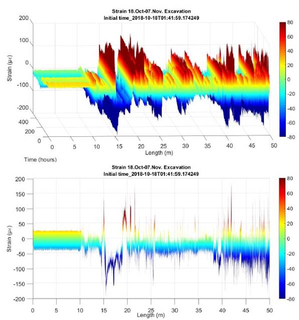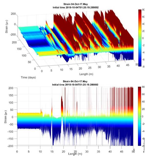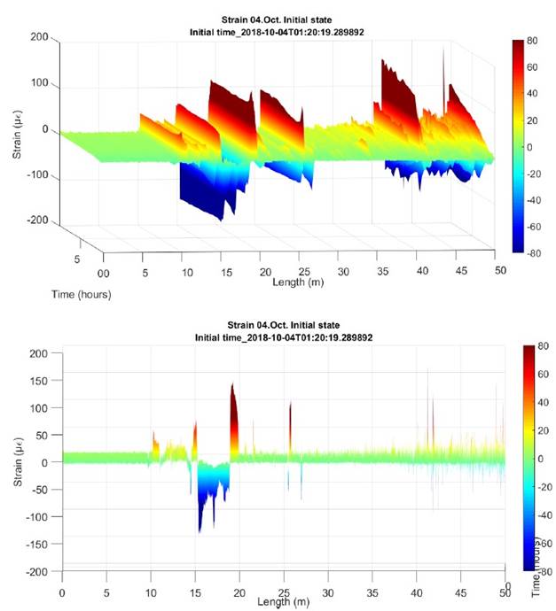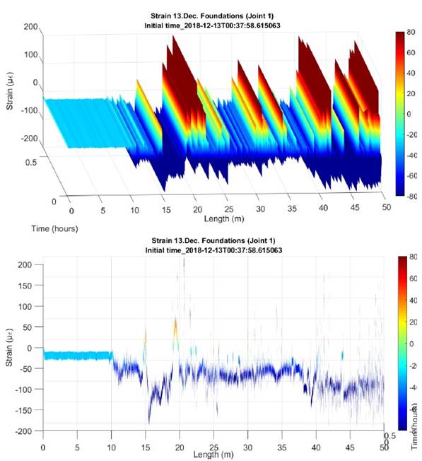 Asimismo, se pueden apreciar picos y/o discontinuidades obtenidas de la monitorización, los cuales corresponden a las zonas de junta entre tramos de las dovelas donde la fibra óptica sufre una desadherencia con el hormigón, ya desde su implantación en origen. Estos picos permanecen estables en lo que respecta a su ubicación.