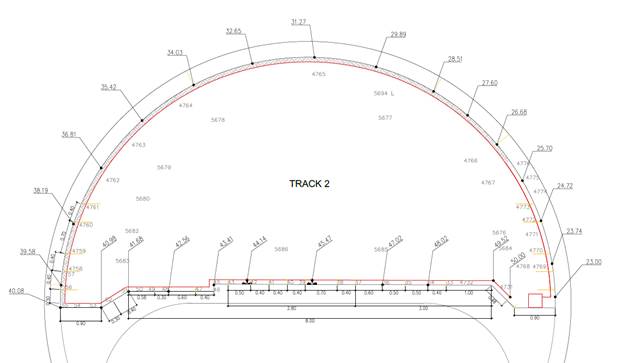 El túnel instrumentado de la L9 es una sección típica con vías superpuestas y losa intermedia. La fibra óptica se ha colocado en el perímetro de la sección transversal, siempre de acuerdo con la Propiedad. La Figura 3 muestra su colocación. La colocación de fibra se ha llevado a cabo siguiendo el perímetro de una sección transversal en la posición indicada en planta.