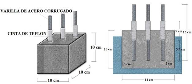 La elaboración de las muestras de concreto se realizó de acuerdo a la norma (ASTM C-31, 2019). Para las pruebas electroquímicas se elaboraron 3 espécimen cúbicos de dimensiones 10 cm por lado con el mismo diseño de mezcla, como se observa en la Figura 1. Se embebieron 3 varillas corrugadas en cada probeta cúbica, de dimensión 0.95 mm de diámetro. La longitud de la varilla embebida fue de 5.5 cm. En la altura de la interfaz de la pasta con el medio ambiente, la varilla se aisló aproximadamente de 5 cm de largo con cinta de teflón alrededor de la barra.