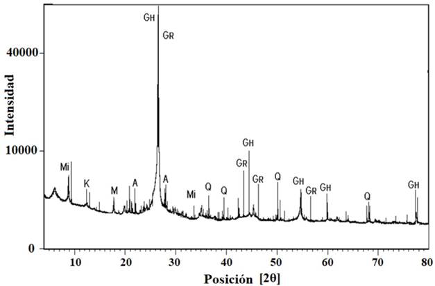 | Figura 2. Difractogramas de rayos -X de GP. Mi: mica; K: caolinita; M: montmorillonita; GH: grafito(2H); GR: grafito (3R); A: anortita; Q: Cuarzo. | ||||