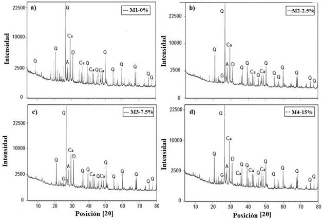| Figura 3. Difractogramas de rayos X de la pasta de concreto. a) M1-0%, b) M2-2.5% c) M3- 7.5% y d) M4-15%. Q: cuarzo; Ca: calcita; D: dolomita; G: grafito; A: andesina, curado a 28 días. | ||||