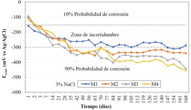 La norma (ASTM C-876-09, 2009), establecen intervalos en el potencial de corrosión (Ecorr) que indican la probabilidad de corrosión de la superficie y posible riesgo de la barra de refuerzo. Con los valores obtenidos es factible elaborar un diagnóstico del grado de corrosión de la armadura de concreto. El análisis de medición del potencial de media celda, se realizó con base en el uso de un electrodo de referencia de plata-cloruro de plata saturado (Ag/AgCl). Se determinó la medición del potencial de cada barra de acero incrustada en el concreto, el valor registrado es el promedio de estas medidas. Las mediciones se realizaron durante 168 días de exposición salina. Se utilizó un multímetro y un interruptor que conectó los dos electrodos, entre el cloruro de plata y la barra de acero.