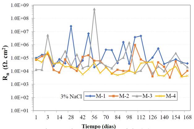El promedio de las fluctuaciones de resistencia de ruido electroquímico se presenta en la figura 6. Al inicio de la medición todas las muestras presentan valores bajos de Rn entre 1x104 Ω.cm2 y 1x105 Ω.cm2; durante los días 28 y 70. La muestra M1 y M3 se observa fluctuaciones altos y bajos de Rn, posiblemente puede ser a la formación de películas de óxido no protector, manteniendo pasivo el metal. Al final del día 168 de exposición al medio salino, todas las muestras mantienen valores bajos de resistencia al ruido alrededor de 1x104 Ω.cm2.