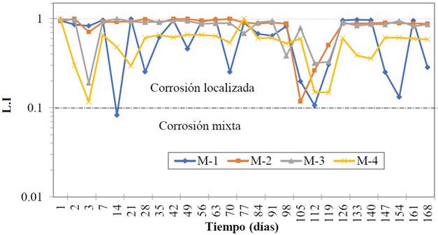 Los valores del índice de localización se muestran en la Figura 7, al inicio de la prueba hasta el final de la exposición. Se pueden observar eventos o corrosión de tipo localizado, debido a que existe una elevada velocidad de disolución del metal en lugares discretos de su superficie (Sanz et. al., 1999). Esto representa un mayor riesgo potencial, debido a su difícil detectabilidad ya que se manifiesta en áreas específicas (Salazar-Jiménez, 2015). Si el tiempo de exposición se prolonga, el inicio de picaduras puede ocurrir en el metal.