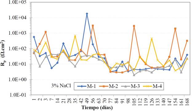 | Figura 9. Valores de resistencia a la polarización (Rp) en el transcurso del tiempo. | ||||