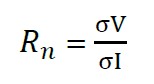 El ruido electroquímico puede ser caracterizado por parámetros estadísticos comunes como la media, la varianza y la desviación estándar; en particular el uso de la desviación estándar de potencial/corriente puede hacerse por separado, o bien por su cociente. Denominado resistencia de ruido (Rn), en la expresión (2) se calcula como el cociente entre las desviaciones estándar del registro de potencial e intensidad de corriente (Sánchez et. al., 2005; Bertocci et. al., 1997).
