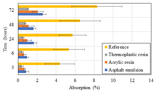 In the first periods of the test, 3 and 6 hours, the behavior of the specimens with the waterproofing products can be considered similar, since the average absorption rate in these periods was approximately 0.659%, all of which are considered statistically equivalent by the statistical test applied. However, in the last reading interval of the test, 72 hours, the specimens of the thermoplastic resin series had the lowest absorption rate of 1.05%, against an average of 2.34% of the other products. At the end of the test, the reference series had an absorption 7.9 times greater than the series of thermoplastic resin, indicating the best behavior. The asphalt emulsion and acrylic membrane remained statistically equivalent, considering the greater variability of standard deviation between them, as shown in Figure 4.