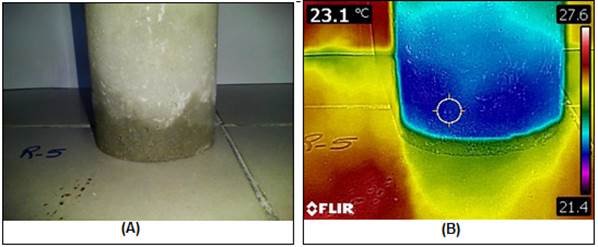 | Figure 9. Thermographic image for the series with acrylic resin. A - Specimen after the diametrical compression test; B - Specimen during the thermography test. | ||||