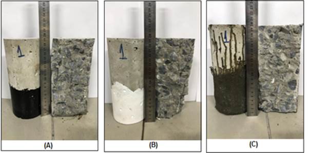 | Figure 7. Specimens of the waterproofed series after the diametrical compression test. A - Sample with asphalt emulsion; B - Sample with acrylic resin; C - Sample with thermoplastic resin. | ||||