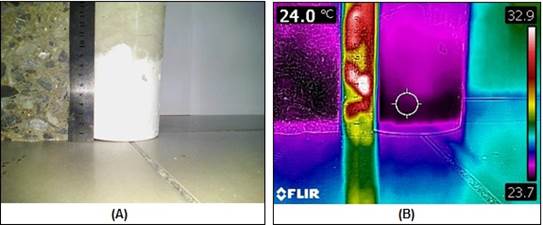 The thermographic images for the reference series, Figure 6, confirm the percolation of water into the specimen, since the temperature obtained in the test was the lowest among the series studied (23.1 ºC).