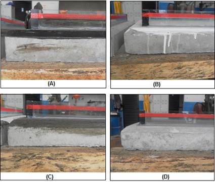 | Figura 2. Resultado del ensayo de estanqueidad luego de 72 horas. A - Losa con emulsión asfáltica; B - Losa con membrana acrílica; C - Losa con resina termoplástica; D - Losa referencia. | ||||