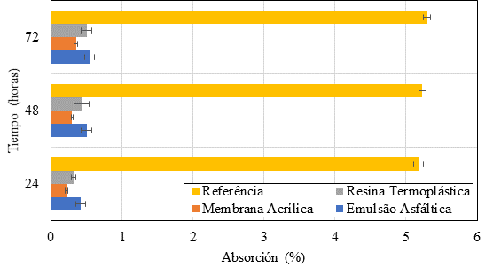 En el período inicial del ensayo, 3 y 6 horas, el comportamiento de las probetas con los productos impermeabilizantes se puede considerar similar, ya que el promedio de la absorción en esos períodos fue entre 0,659%, siendo todos considerados estadísticamente equivalentes por el ensayo estadístico aplicado. Por tanto, en el último intervalo de lectura del ensayo, 72 horas, las probetas de la serie resina termoplástica presentaron menor valor de absorción de 1,05%, contra un promedio de 2,34% de los demás productos. Al final del ensayo la serie referencia tuvo una absorción 7,9 veces mayor que la serie de resina termoplástica, que tuvo el mejor comportamiento. La emulsión asfáltica y membrana acrílica se mantuvieron con equivalente estadísticamente, considerando la mayor variabilidad de desviación estándar entre ellos, según Figura 4.