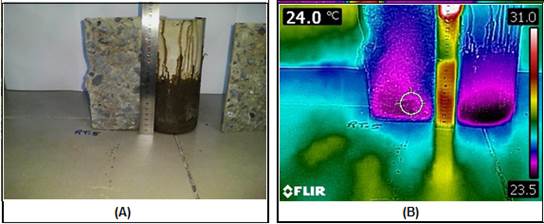 | Figura 8. Imagen termográfica infrarroja para la serie con emulsión asfáltica. A - Probeta luego del ensayo de compresión diametral; B - Probeta durante el ensayo de termografía . | ||||