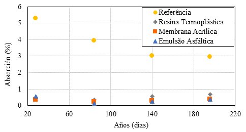 Todas las series impermeabilizadas presentan a los 84 días absorción inferior a la presentada a los 28 días, también explicado por el secado y fijación de los productos en el período. Todavía, a partir de los 140 días fue posible notar una inversión del comportamiento, es decir, las series pasaron a presentar absorciones mayores si se compara a la edad de 28 días.