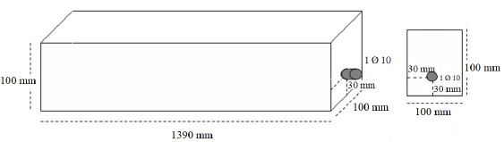 The prismatic specimens were molded two by two. To maintain coverage, 3 spacers of 30 mm were placed along the steel bar. Figure 2 shows the dimensions of the prismatic specimen and the position of the steel bar.
