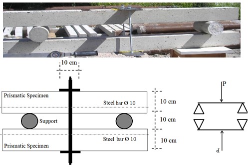 The prismatic specimens were under constant loading until the test dates. The diagram shown in Figure 4 shows the prismatic specimens supported by cylindrical concrete specimens (10 x 20 cm) with a central porch composed of two steel plates and two threaded bars (9.5 mm, 3 nuts, 3 washers and two steel plates of 8 x 300 x 100 mm) applying the load of 250 kgf, causing holes in the center of the beams, with openings of up to 0.3 mm (within the limits of the NBR 6118 standard). The loading was carried out by applying a torque of 0.5 Kgfm, with a torque wrench, to the threaded bars and, consequently, the concentrated force was applied to the prismatic specimen causing the crack.