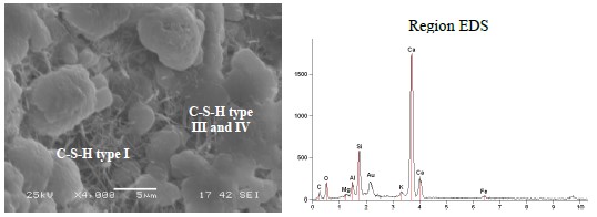 In the image of Figure 10 some needles are observed, but in the EDS the element sulfur (S) is not present to configure an ettringite. In this case, they can be C-S-H needles, with fibrous morphology (Type I) (Taylor, 1997; Ghosh, 2002). Phases C-S-H type III and type IV are also observed.