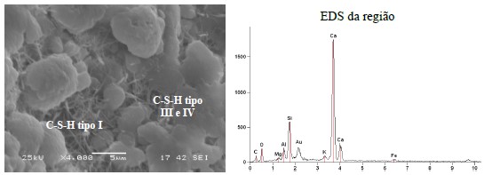 Na imagem da Figura 10 observam-se algumas agulhas, mas no EDS o elemento enxofre (S) não está presente para que se configurasse uma etringita. Nesse caso podem ser agulhas de C-S-H, com morfologia fibrosa (Tipo I) (Taylor, 1997; Ghosh, 2002). Observam-se também as fases C-S-H tipo III e tipo IV.