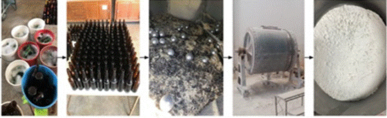 Para la realización de esta investigación se utilizó como aglomerante cemento Portland CPV-ARI, humo de sílice y polvo de vidrio. Se usó polvo de vidrio con el tamaño de partículas pasantes del tamiz # 200 (partículas de menos de 75 µm). Se utilizaron vidrios clasificados como cal sodada, de botellas post-consumo de color ámbar, para minimizar las variaciones no controladas debido a los tintes. Después de la recolección, las botellas de vidrio se lavaron en agua con detergente para eliminar etiquetas, tapas, pegamento e impurezas. Luego se secaron al aire y se trituraron en una hormigonera cargada con esferas de acero cromado. Después de triturar, el vidrio se molió en un molino de bolas, que tenía un revestimiento de sílex, con las bolas utilizadas para el proceso de molienda del material. El vidrio resultante de la trituración del molino de bolas se secó en horno a 110 ° C ± 5 ° C durante 24 horas. Después del secado, el vidrio se tamizó en un tamiz mecánico, en un tiempo promedio de 15 minutos por cada 200 g de polvo de vidrio. La figura 1 muestra el proceso para obtener el polvo de vidrio.