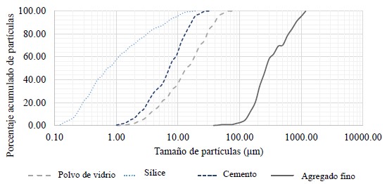 La Tabla 4 muestra las características químicas del cemento, el humo de sílice, el polvo de vidrio y el agregado fino utilizado.