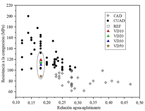 Al reducir la relación agua/aglutinante, aumenta la resistencia a la compresión; sin embargo, para mezclas de CCUAD en la misma relación agua/aglutinante, se lograron diferentes resistencias a la compresión debido a otros factores, como la cantidad y tipo de cemento o humo de sílice.