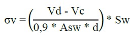 Onde σs representa a tensão nas armaduras tracionadas (kN/cm²); n é a divisão entre o módulo de elasticidade do aço e do concreto; M é o momento de inércia (kN.cm); d é a distância da face comprimida ao centro de gravidade das armaduras tracionadas (cm); x é a linha neutra (cm); III representa a inércia equivalente no Estádio II (cm4); "σc" é a tensão de compressão no concreto (kN/cm²); σv é a tensão nas armaduras transversais (α=90º) (kN/cm²); Vd é o esforço cortante de projeto que atuará nos estribos (kN); Vc é o esforço cortante absorvido por mecanismos complementares (concreto); e, Asw é a área de aço transversal necessária ao longo de 1 m (cm²/m).