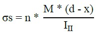 Donde σs representa la tensión en las armaduras traccionadas (kN/cm²); n es la división entre el módulo de elasticidad del acero y del concreto; M es el momento de inercia (kN.cm); d es la distancia de la cara comprimida al centro de gravedad de las armaduras traccionadas (cm); x es la línea neutra (cm); I II representa la inercia equivalente en el Estado II (cm4); 휎푐 es la tensión de compresión en el concreto (kN/cm²); 휎푣 es la tensión en las armaduras transversales (α=90º) (kN/cm²); Vd es el esfuerzo cortante de proyecto que actuará en los estribos (kN); Vc es el esfuerzo cortante absorbido por mecanismos complementares (concreto); y, Asw es el área de acero transversal necesaria a lo largo de 1 m (cm²/m).