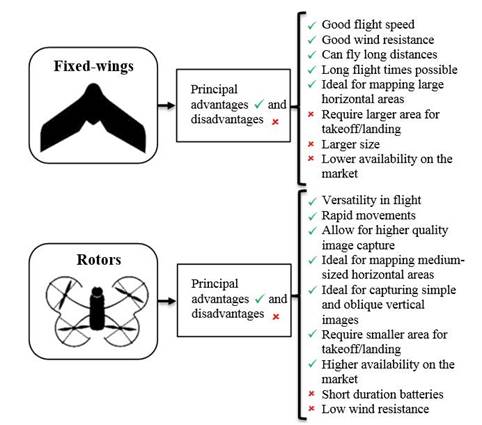 Similarly, the versatility of this aircraft allows it to move on all possible axes, being effective in capturing simple vertical and oblique vertical images as shown in the case studies of Mader et al. (2016), Morgenthal and Hallermann (2015), and Reagan et al. (2018) in the detection of specific surfaces or elements, making it a useful tool for the visual inspection of vertical facades or, as in the case of Irizarry and Costa (2016), a visual tool for construction site management. Figure 1 presents the summary of the main advantages and disadvantages of vehicles with fixed and rotating wings.