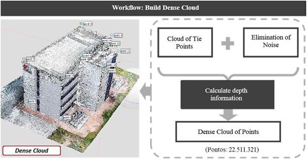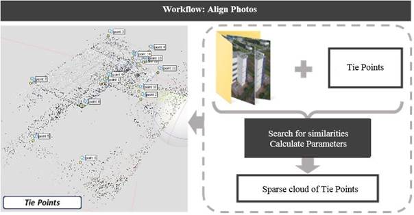 The first step consisted of the alignment of the images (align photos), in which Agisoft PhotoScan seeks similarities between the images. The result is the generation of a cloud of tie points, the basic product for the generation of the densified point cloud and 3D models, as well as the connection point between the orthophotos in the mosaic process and the generation of the orthophoto mosaic.