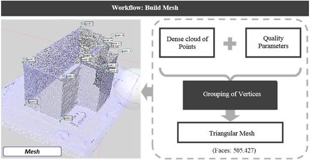 According to Ballesteros (2020) and Pierrot-Deseilligny et al. (2011), this ratio between the distance in position of the stations for taking photographs and distance from the stations to the photographed facade is ideal for 3D reconstruction. If this ratio is very small, the automatic correlation of the points is facilitated, but the geometric accuracy in the digital reconstruction of the facade becomes more difficult.