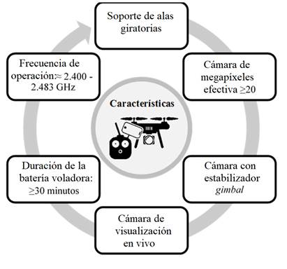 Del mismo modo esos vehículos comúnmente son simples de pilotar, la sustentación es dada por el conjunto de motores controlados por un sistema electrónico sofisticado que generalmente garantiza una buena estabilidad de la aeronave, que permite despegue y aterrizaje vertical. Por tanto, son la opción principal para cargar cámaras y otros objetos sin grandes desplazamientos del punto de despegue. En la Figura 2 son presentadas las características mínimas sugeridas para el equipo con el propósito de la inspección visual de fachadas.