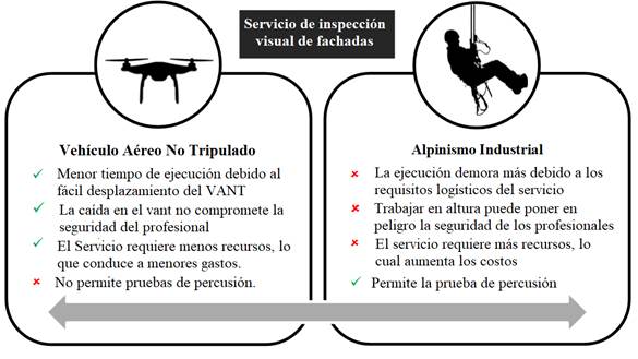 En los últimos años ha habido un aumento en el uso de VANT para la inspección de estructuras civiles, específicamente edificaciones, debido a su largo alcance, aplicaciones de fotogrametría área, registro eficiente de datos, velocidad, seguridad y reducción de costos entre otros (Izarry y Costa, 2016; Shariq y Hughes, 2020; Groso et al., 2020). En la Figura 3 las ventajas reportadas del uso de VANT en la revisión bibliográfica son comparadas a uno de los métodos tradicionales más utilizados, o alpinismo.