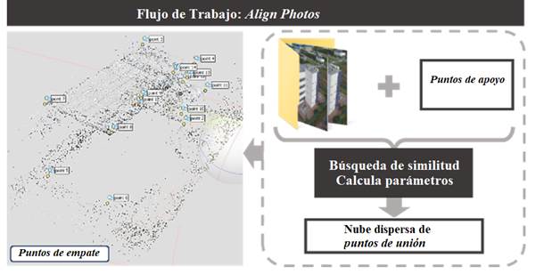 La primera etapa del procesamiento consistió en el alineamiento de las imágenes (Align Photos), en el cual Agisoft PhotoScan busca semejanzas entre las imágenes. El resultado final es la generación de la nube de Tie Points o puntos de amarre, ella es el producto básico para la generación de la nube de puntos densificados, modelos 3D y ponto de conexión entre las orto fotos en el proceso de mosaico y generación de las orto fotos.