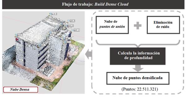 En la segunda etapa fue construida la Dense Cloud ó nube densa de puntos 3D con el filtrado de los puntos no deseados o ruidos. Así, a partir de las posiciones estimadas de la cámara, el software calcula las informaciones de profundidad para cada cámara para ser combinadas en un único punto de la nube densa.
