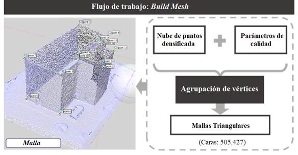 En la tercera etapa fue construida la Mesh o malla, generada a partir del agrupamiento de vértices de la nube densa de puntos. El modelo 3D generado en esta etapa es presentado en la Figura 8, con más de 500 mil caras o polígonos adyacentes, compartiendo aristas de la superficie de frontera del objeto.
