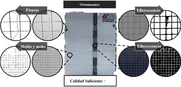 Eso es demostrado en la Figura 12, en la cual el orto mosaico de la fachada sur permitió el descubrimiento de fisura del revestimiento cerámico, inicio de eflorescencia en la fachada y, fallas surgidas de procesos biológicos (Moho).