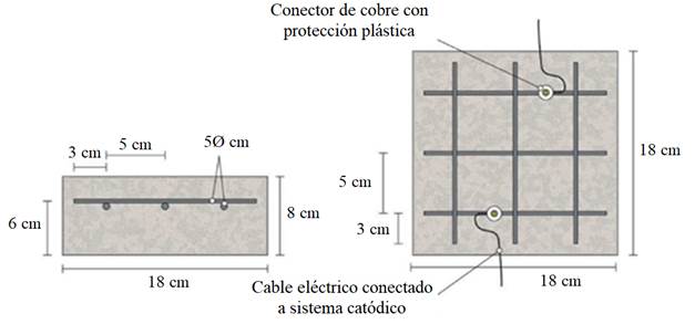 | Figura 1. Esquema del refuerzo de las probetas y la conexión del sistema catódico (refuerzo de acero). Adaptado de (Carmona, et al, 2015a). | ||||
